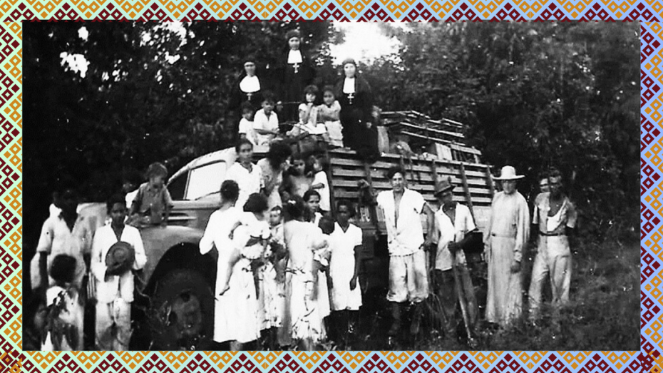 Na foto, depois de seis dias de viagem, de Campo Grande a São Lourenço, sobre a carroceria de um caminhão, percorrendo trilhas no meio do sertão, após atravessar o rio, o caminhão atolou novamente. As poucas famílias que havia, vieram felizes ao encontro de Dom Vunibaldo e das Missionárias, que ainda se encontravam sobre o caminhão.
