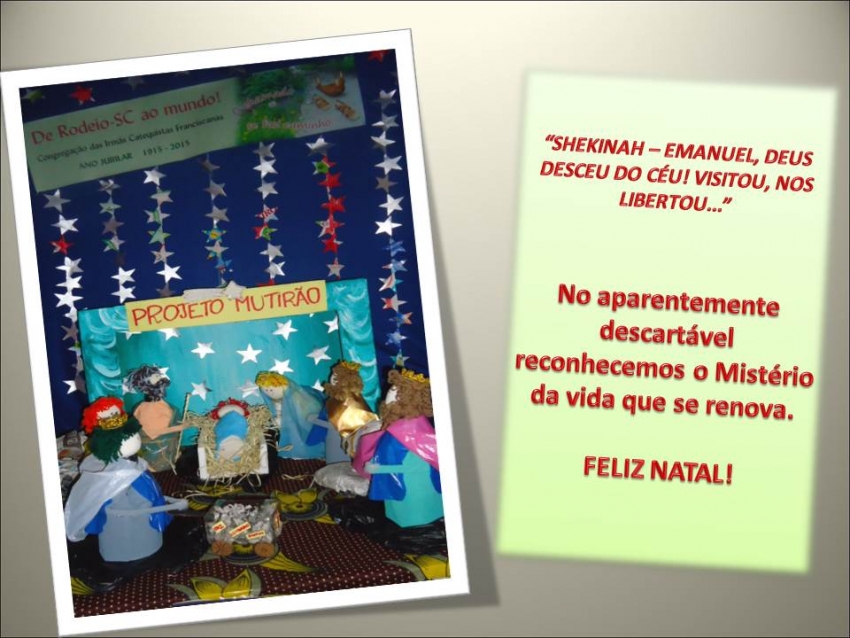 A partir desta trajetória missionária e da realidade que vivem os catadores no seu dia-a-dia de trabalho e luta por uma vida mais digna é que nasceu a inspiração para fazer o presépio em material reciclado.Socializamos a ideia com o grupo de simpatizantes do Carisma e com o pessoal do Projeto Mutirão. Algumas pessoas aderiram à proposta e pudemos contar com a colaboração de algumas artesãs. Uma caixa de papelão, jornal, sacos plásticos, garrafas pet, restos de lã, retalhos, fomos tecendo ideias e com nossas mãos demos VIDA ao que num primeiro momento parecia descartável.