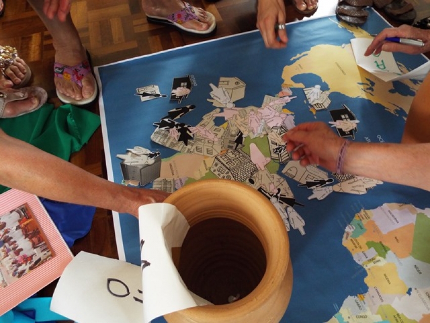 No terceiro momento, rezamos o hino do centenário. Enquanto o mesmo foi sendo recitado e cantado, montou-se um cenário com diversos símbolos. Depois fomos convidadas a contemplar o cenário, sobretudo da parte onde colocamos no mapa nossas casas e fraternidades que tinham representantes no encontro. Foi interessante observar que o mapa era pequeno e os desenhos das casas e pessoas um pouco grandes. Com a falta de espaço, houve quem empurrou outra casa para colocar a sua no mapa. Isso foi um dado significativo. Estamos “amontoadas” em três países: Chile, Argentina e principalmente no Brasil e, toda outra parte do planeta sem nossa presença. A partir desta constatação, refletiu-se sobre diversos outros aspectos de nossa vida, como: nossa forma de organização; estruturas que emperram a vida cotidiana; não envolvimento com projetos missionários; vocações e animação vocacional; acolhida umas das outras; correria sem propósito claro; não convivência com a juventude; não estamos fazendo diferença na organização capitalista mundial; estamos concorrendo entre nós.
