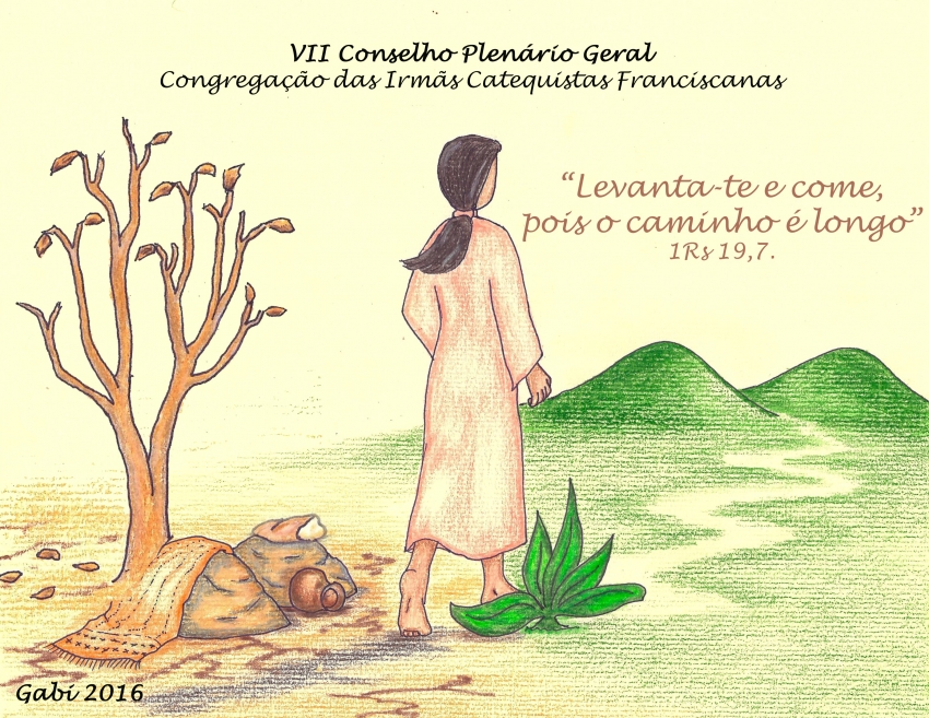 Com ternura, beleza e leveza nossa juniorista de Guatemala irmã Gabriela Lourdes Noj Nij, nos presenteia com a logo do VII Conselho Plenário, que ilustra o tema escolhido por nós: “Levanta-te e come, pois o caminho é longo” (1Rs 19, 1-7), experiência feita pelo profeta Elias que nos desafia a fazer a nossa própria experiência.