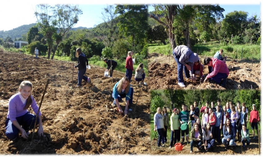Após a conversa no salão, todos/as se dirigiram para o local onde se fez o plantio das mudas nas margens do riacho que corta o terreno da unidade de Educação Ambiental. Professoras, alunos e irmãs, num mutirão pela vida, plantaram mudas de várias espécies nativas. Foram plantadas aproximadamente, 700 mudas de árvores nativas.