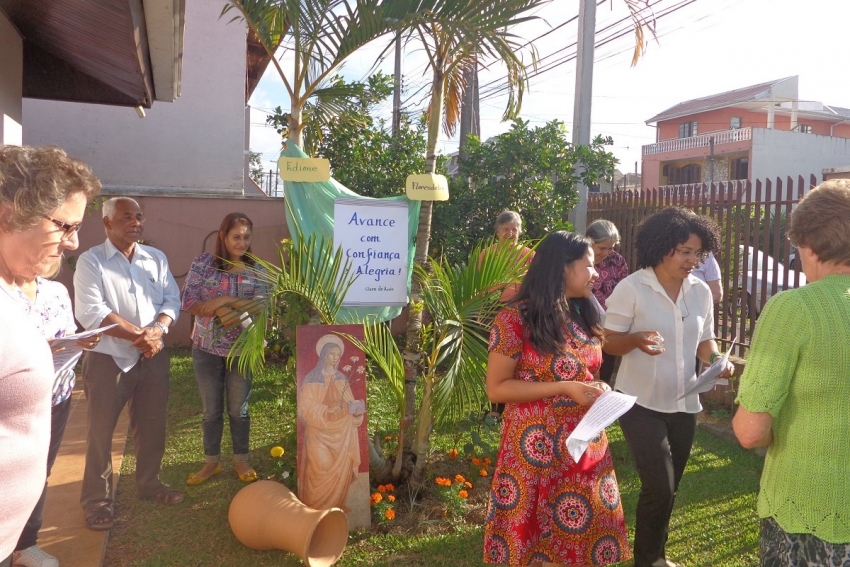 Cantamos o Cântico das Criaturas em caminhada até o Jardim da nossa casa e lá fomos ungidas com óleo perfumado, com palavras perfumadas e com a vida embebida da presença carinhosa de todos/as os que conosco exclamaram: “Avancem com confiança e alegria”!