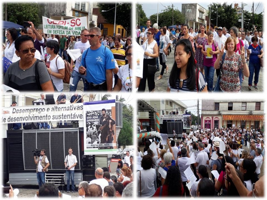 Foi emocionante! Em comunhão com a dura e desafiadora realidade vivida no mundo do trabalho, durante a caminhada pelas ruas da cidade de Araquari, cantamos: “Trabalhadores, Trabalhadoras, Deus também é Trabalhador”, rezamos, silenciamos, nos penitenciamos “poucos os operários, poucos os trabalhadores e a fome do povo aumenta mais e mais. Ouve esta nossa prece...” nos solidarizamos com todas as classes trabalhadoras sofridas, exploradas e mortas pelo sistema vigente.