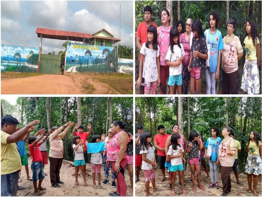 Estivemos reunidas para o retiro ecológico, na aldeia Akratikatêjê, da tribo Gavião, Ir. Zélia Maria Batista, as formandas Jadiane Silva de Araújo e Patrícia Costa Cardoso, a vocacionada Thainá Nogueira Lobo, as leigas: Vanalda Gomes Araújo, colaboradora do CIMI, Fernanda Lowe, missionária recém-vinda do Rio Grande do Sul e eu, Ir. Iria Minosso.