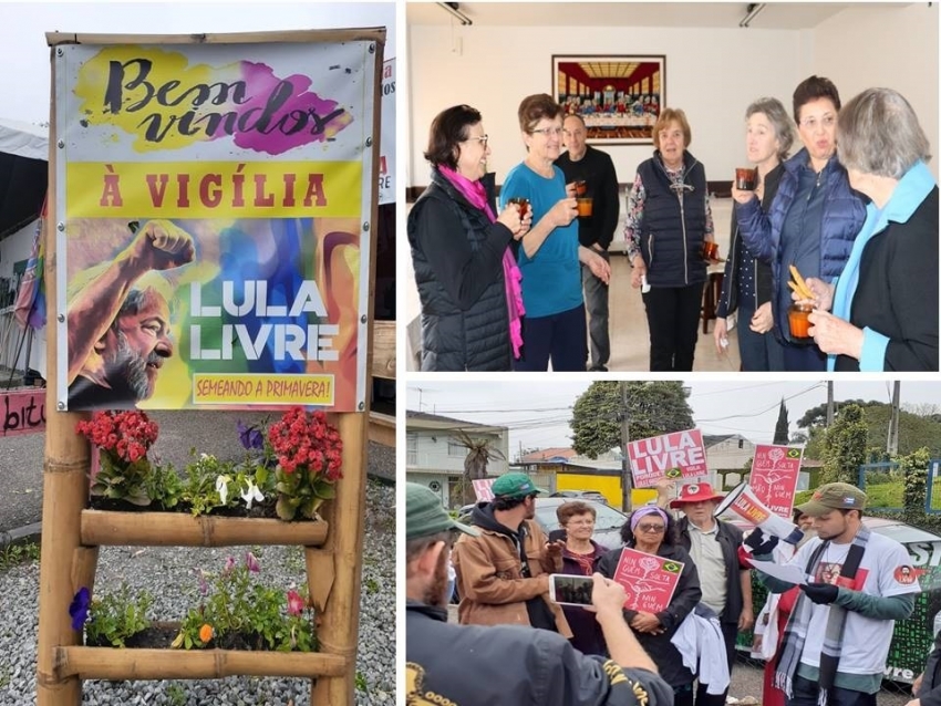 Permitam-me partilhar, que apesar da dor por toda a injustiça cometida contra Lula, especialmente agora quando a verdade está vindo às claras através do The intercept, tenho a felicidade de viver momentos especiais aos domingos. No meio da tarde, dirijo-me ao espaço da Vigília Lula, e junto com um grupo preparamos a celebração inter-religiosa que acontece sempre das 18h às 19hs, quando solenemente damos o boa noite Lula. Esta celebração é momento de fortalecimento de fé e esperança para todas as pessoas presentes, especialmente para aqueles/as que desde o dia 07 de março de 2018, marcam presença naquele espaço em frente ao prédio da justiça Federal.