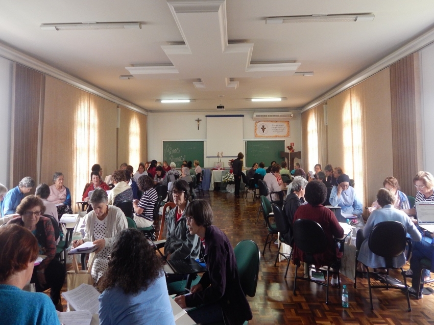 Motivadas pelo silêncio, fomos introduzidas à temática do Discernimento Comunitário - que exigiu de cada uma o exercício da escuta, acolhida, abertura. Esse processo de discernimento foi a metodologia assumida durante o Ano Capitular. Nesta Assembleia, continuamos sua vivência na construção do próximo plano quadrienal e organizacional. Para isso, a assembleia foi organizada em sete grupos de base, que são o lugar da reflexão, da partilha, da construção de consensos. Esse é um processo orante e dialógico; pessoal e grupal, que gera um movimento do Eu para Nós, marcado pelo silêncio, pela escuta atenta, abertura ao novo e diálogo respeitoso.