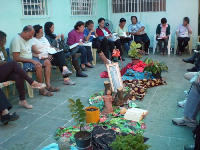 Formando uma grande roda, Irmã Alzira nos acolheu com um poema em nome do “Deus de todos os nomes: Javé, Sofia, Ruah, Shekinah, Luz, Rochedo e Água Viva, Olorum, Tupã, Ngana, Amithaba, Suku, Ngala, Alá, Rama...”. Em seguida, ouvimos uma mensagem enviada por Irmã Beatriz, a quem agradecemos o carinho e a sintonia.